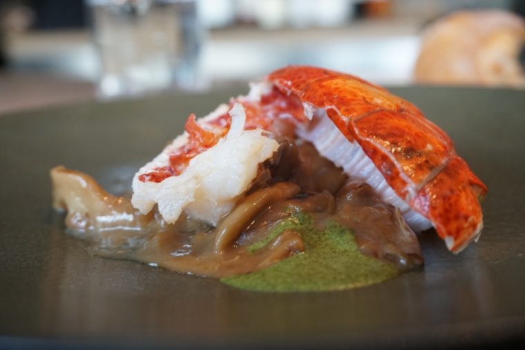 「オマール海老のポワレ」さまざまなキノコと甲殻類のクリームソースと一緒に