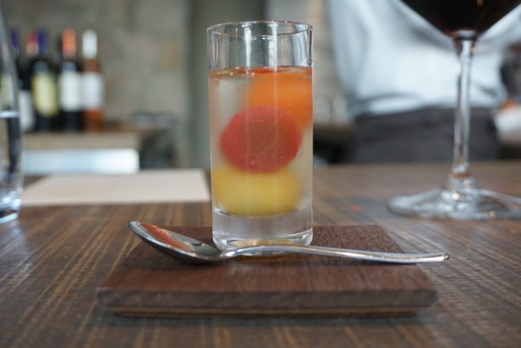 続く料理でさっそく「ラス (L’AS)」のスペシャリテが登場します。ハーゲンダッツのクリスピーサンドを意識したというフォアグラ料理でございます。ジャムは季節で変えていくそうで、今回はストロベリー味でいただきました。ハーゲンダッツの中の味が楽しみなのと同じ感覚です。それに、ストロベリーはクリスマスケーキの定番ですしね!フォアグラとフルーツが相性がいいことは証明済み、アイデアの力で料理を楽しいものにしてくれています。