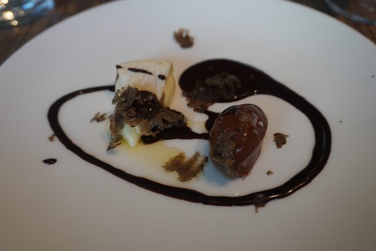 「濃厚ショコラのクネルとガレドラロワールチーズのマリアージュ」トリュフ添え