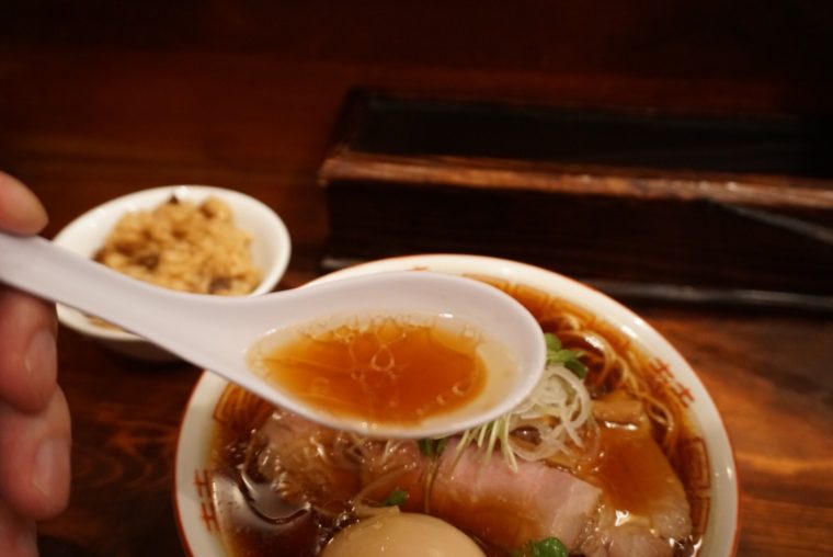 琥珀色のスープを一口すすると、口いっぱいに広がるのは鴨の旨味!!鴨ガラを使ったとったスープに加え、脂も鴨のものを使っているのでしょうか。動物系で濃厚な味にも関わらず、あっさりいただけるのは鴨がゆえなのでしょう。