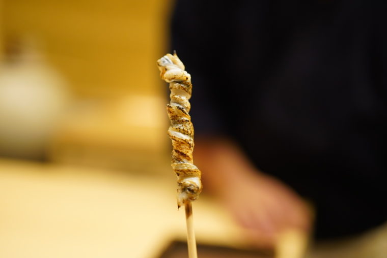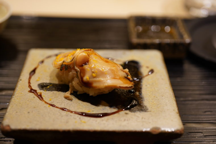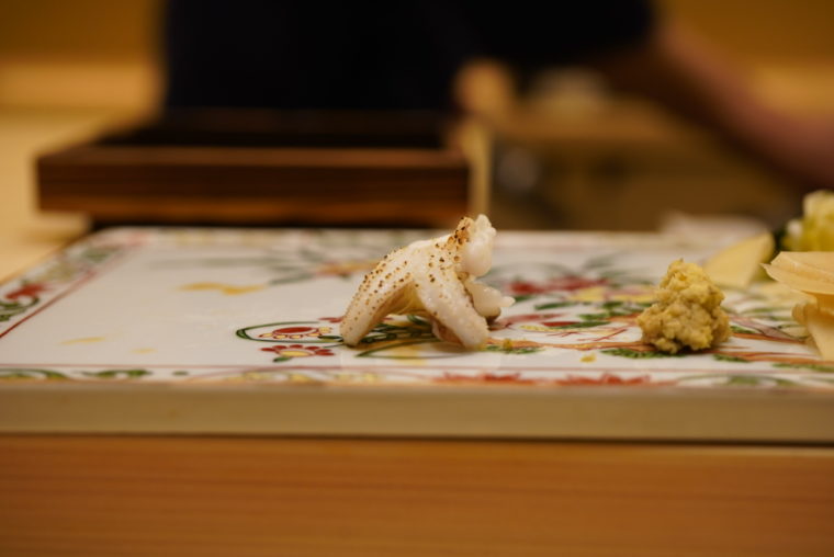 さえ㐂の代名詞といえばユニークなつまみ。伝統的な江戸前寿司の多い銀座エリアでは殊更ユニークに見えることでしょう。東京に来て「鯛」の仕入れには苦労しているそうです。さえ㐂名物の1つだった鯛がないのは残念だが、何かを失えば何かを得るもの。きっと新しい名物が生まれることでしょう。 「白子」山葵と岩海苔醤油で