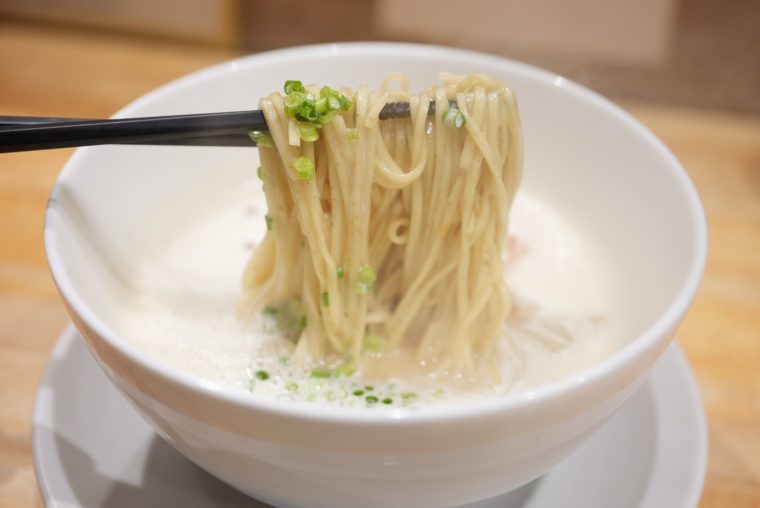2021.06.19 昼 一番人気は「獅子丸ぱいたんらぁめん」@麺家獅子丸 ラーメン・つけめん 名古屋市 〜999円 ★★★★☆ 名古屋駅太閤口から徒歩数分、高架下にあるラーメン店『麺家獅子丸』が今回の目的地。市内に3店舗展開する「半蔵グループ」というグループに属しているよう。それぞれのお店でコンセプトを変えているようで、獅子丸のコンセプトはずばり”洋”。洋風のカフェのような内観で、順番を待つ列の中には女性客の姿が目立ちます。”洋”ならではの光景、コンセプトがお客様にしっかり伝わっている証拠と言っていいでしょう。 獅子丸ぱいたんらぁめん、820円也。 真っ白なシルエットはラーメンのものとは思えぬもの。鶏白湯のクリーミーなスープをエスプーマが覆っているような形。このままだと濃厚な味わいを想像させますが、節類や昆布といった和風出汁が品のいい仕上げにつながっております。気のせいか、牛蒡のような土っぽい風味があるような。これも落ち着いた印象を作る一助になっております。麺は弾力のあるもので主張が強いが、スープの味わいやエスプーマなタッチが一体感を感じさせてくれます。 お洒落なイメージはトッピングや調味料の中にも。ローストビーフ、鶏ハム、豚チャーシューの3種類のチャーシューがありますが、特に鶏チャーシューが美味。胡椒の具合がきっといいのだろう。アクセントにピンクペッパーをあしらっているのも洋の印象を強めております。 味変にはニンニク入りのペッパーオイル。こちらには木の子のグアニル酸的な旨味が感じられます。 そういえば、半蔵に獅子丸など、戦国時代を想起させるネーミング達ですね。さすが戦国三英傑を生んだ名古屋じゃあありませんか。大変美味しくいただきました。ご馳走様です! — 麺家獅子丸052-453-0440愛知県名古屋市中村区亀島2-1-1https://tabelog.com/aichi/A2301/A230101/23060674/