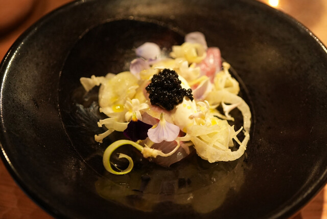 見た目にも華やかな一皿。ウイキョウオイルの風味やキャビアの塩気などを加えて、バランス感覚の高いサラダ風の一品に仕上げる。少々いかった石鯛は、脱水して最低限の旨味を引き出すなど、ここもバランスのいい落とし所をしっかりと見つけている。期待感を高めるのに十分のスタート。