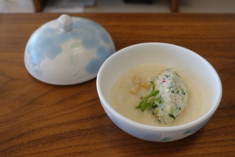 これも韓国の定番の松の実を使ったポリッジ。韓国の朝ごはんのイメージなのでしょうか。それだけでは終わらず、旨味の染み込んだ蟹と組み合わせて全体のバランスを作っております。