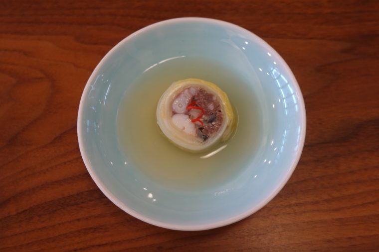 キムチのアップデート版。唐辛子を使用しない熟成した白キムチで牛肉や鮑や海老を包み込み、目にはシンプルで美しいシルエットを楽しませ、舌には贅沢な味を届ける。まさに伝統に根付いたアップデート料理。出汁は牛肉からじっくり取っております。ちなみに、これが一番仕込みが大変だそうだ。