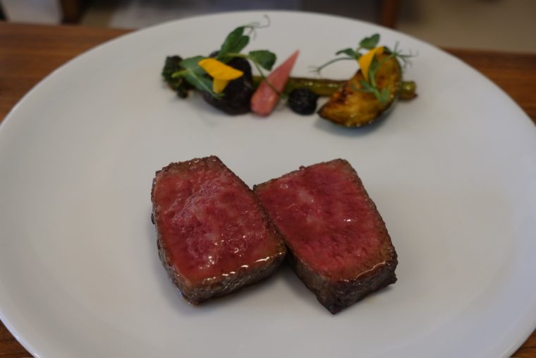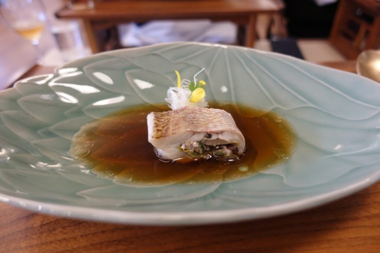大地と海を意識したような料理。スープにはオイスターなので旨味を補完しているが、どこか土っぽさを感じるもの。一方え、海苔が作る磯っぽさが海の雰囲気を作ります。食材には鯛のような魚が参加。一緒に提供された辛味大根がいいアクセントに。