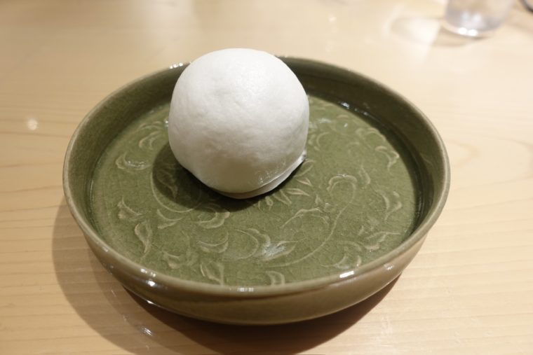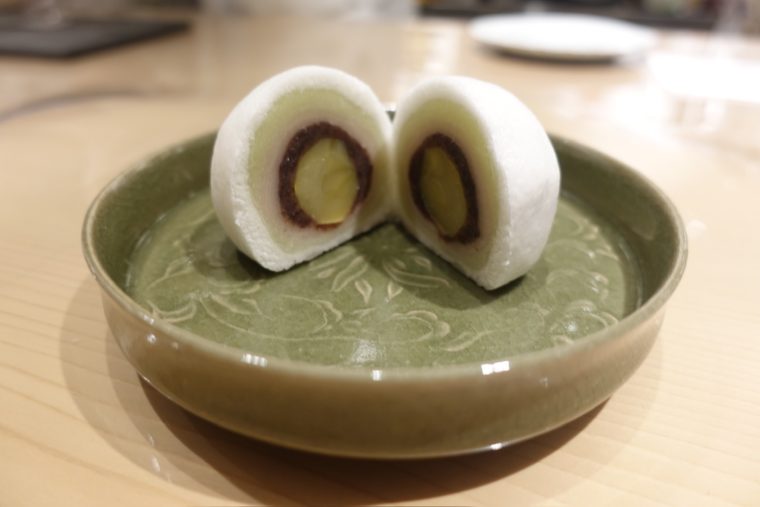 真っ白なシルエットの饅頭ですが、その中には栗を中心につぶし餡、紅で染めた白餡、うぐいす餡が層を作り、薯蕷の皮で包んでおります。幾つかの餡のバリエーションが美しさと口当たりのユニークさを作っております。