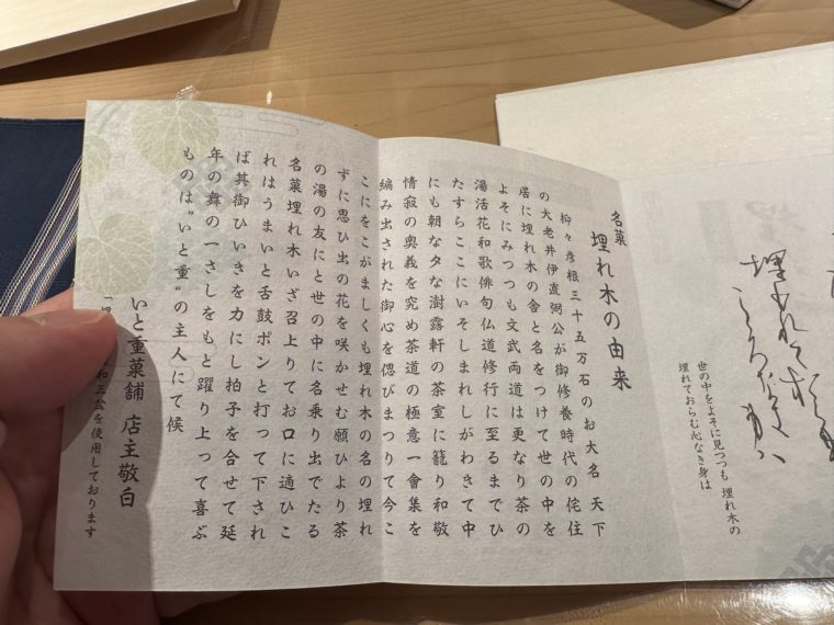名物である「埋れ木」もまた直弼公がエピソードが由来である銘菓。江戸幕府の大老を務めた人物でありながら、若い頃は恵まれた立場ではなかったそう。その境遇を地中に埋まった木々のことである「埋れ木」と名付けた、いわば自虐の言葉。