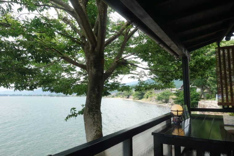 琵琶湖を望む絶景が魅力的なカフェだが、実はこのあたりの海津エリアは重要文化的景観に選ばれております。江戸時代に築かれたという石積群の上に立つのもまた素敵。古道具店と併設しているその雰囲気も歴史的な情緒に拍車をかけております。テラスに出れば眼前に広がる琵琶湖の景色のみならず、静かなな波の音が耳に心地よく、五感全体に癒しを提供してくれます。なんて素敵なカフェなのでしょう。