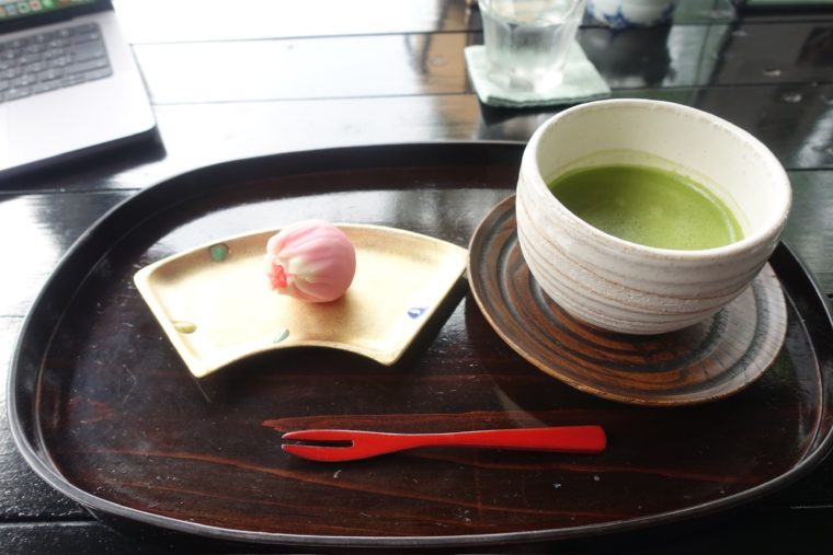メニューは、ケーキや和菓子などのセットにカレーの用意まで。今回は抹茶セットをいただきましたが、こちらは同じく海津にある和菓子店「駿河屋」のもの。こうして素敵な景色に、季節を彩る和菓子が加わります。ちなみに、現在は芍薬の花。