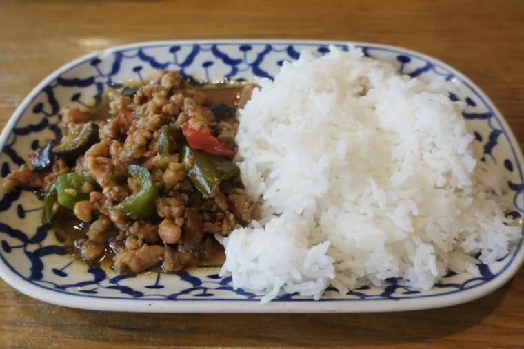 粗挽きの鶏挽肉をベースに、唐辛子、ピーマンを効かせた強火炒め。ナンプラーのコクが味の芯を作り、辛さと旨味が一斉に押し寄せる。ジャスミンライスとの相性は言わずもがなで、口に運ぶたび、まるで現地屋台の活気まで伝わってくるようだ。