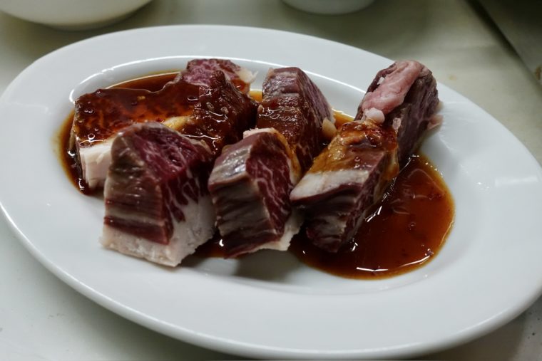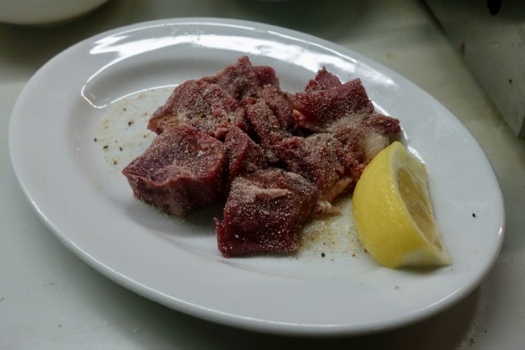 2025.05.17 夜 洗う!?圧倒的な塩気と脂に挑む京都ホルモン@ アジェ 松原本店 焼肉・肉料理 京都市 3000円〜4999円 ★★★☆☆ 京都・河原町の裏路地。賑わいから少し身を引いたこの一角に、異様な熱気を放つ焼肉店『アジェ 松原本店』がある。1997年創業、京都ホルモン文化の象徴とも言える存在だ。入口に灯る「塩ホルモン」の提灯が目印。店の外には常に人の気配があり、店内には煙と笑い声が絶えない。 まずは名物「ホソ塩」。そのビジュアルは圧巻だ。脂が滴るような白いホルモンに、塩がこれでもかと振りかけられている。鉄板に乗せた瞬間、バチバチと脂が弾け、炎が立ち上がる。火力にびびっては食べられない。しっかり火を通せば、ぷるんと弾力のある食感と、ジュワッと広がる甘い脂が待っている。 そこに用意されるのが、ホソ専用のタレ。旨味と塩気が極端に設計されたホルモンに対して、タレはやや出汁のようで、まさに脂と塩気を洗うようなイメージ。リセットと再スタートを繰り返しながらで食が進んでいく。 「テッチャン」や「上ミノ」など、内臓の品ぞろえも豊富で、それぞれに食感と風味の違いが明確。 「赤身ミックス」はタレで提供され、濃い味わいが酒を呼ぶ。アジェが発祥と言われる 「上タンスジ」はコリコリした歯応えと濃厚な旨味が共存している。 そして「極上ハラミ」。分厚くカットされた一枚は、噛み締めるほどに肉の旨味があふれ出し、程よい脂の乗りが食欲を加速させる。赤身らしい力強さと、焼肉としての満足感が高い一本だ。 そして忘れてはならないのが「ホルモン焼きそば」。たっぷりのホルモンが主役で、ソースの辛さに紅生姜のアクセント。これだけ食べに来る人がいるというのも頷ける存在感だ。 全体的に、味つけはとにかく強め。圧倒的な塩気と脂だからこそ、出汁のようなタレが活きるし、ビールや白飯という“受け皿”の存在価値が跳ね上がる。しょっぱい、でも止まらない。体には優しくないが、胃袋は正直である。『アジェ 松原本店』は、ホルモンの世界にどっぷりと浸かれる場所なのだ。ご馳走様です。 — アジェ 松原本店075-352-5757京都府京都市下京区西木屋町通松原上ル東側 美松会館 1Fhttps://tabelog.com/kyoto/A2601/A260201/26000080/