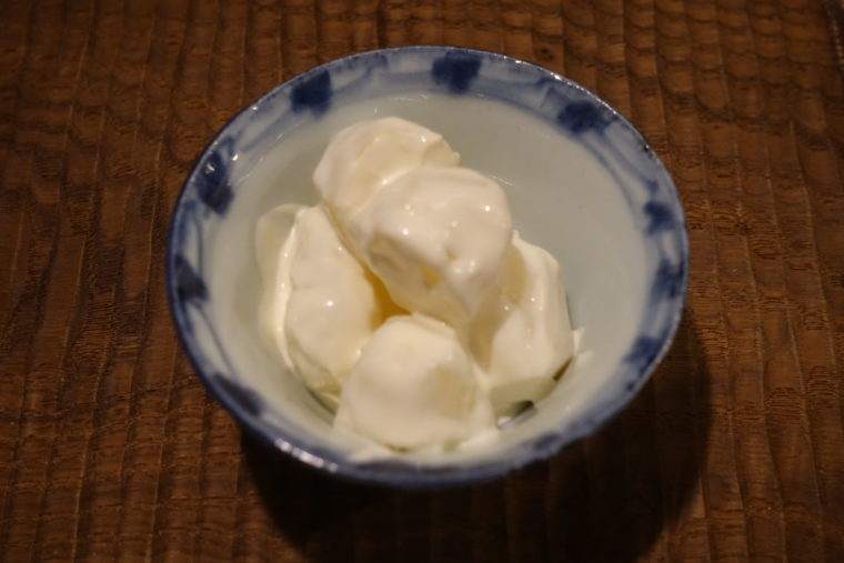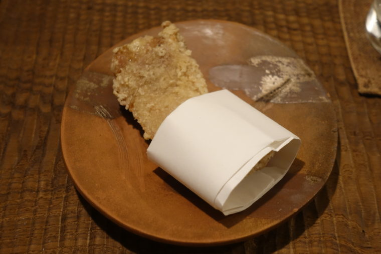 「鯛さんしょ餅」は、玄米餅のもっちりとした食感に、鯛そぼろの旨味、山椒の爽やかな香りが重なる一皿。シンプルながらも風味の立ち上がりが鋭く、ひと口で酒を呼ぶ設計になっている。香りと塩気がちょうどよく、肴としての完成度が高い。