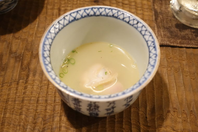まず供されたのは「蛤のお椀」。お通しとしては異例の完成度で、出汁の澄みきった香りにまず心を奪われる。ふっくらと炊かれた蛤からは旨味が溢れ出し、一口で静かな余韻に包まれる。和食の入口として、これ以上ない一杯だ。