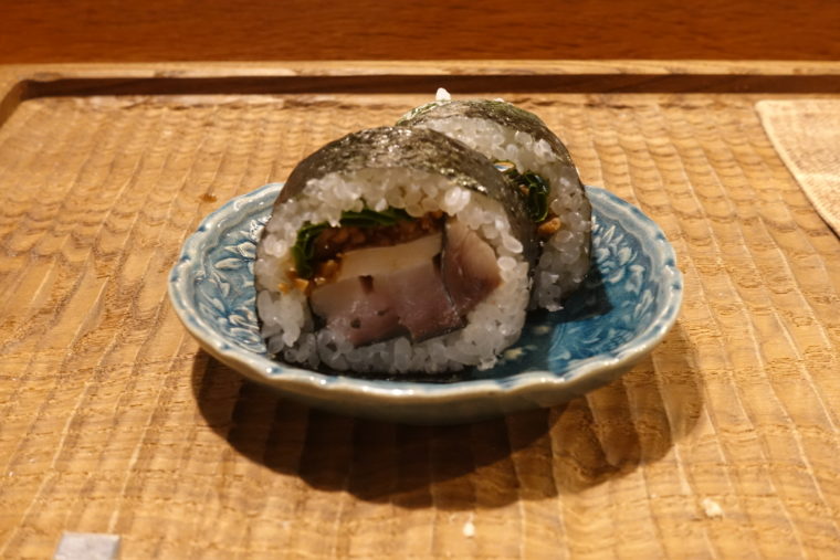 「晴ル風鯖寿し」は、太巻きスタイルで供され、鯖の旨味を閉じ込めつつ、酢飯、生姜醤油漬けの香りが後押しする。手でつまんで頬張ると、海苔と酢飯と脂の一体感に幸福感が広がる。