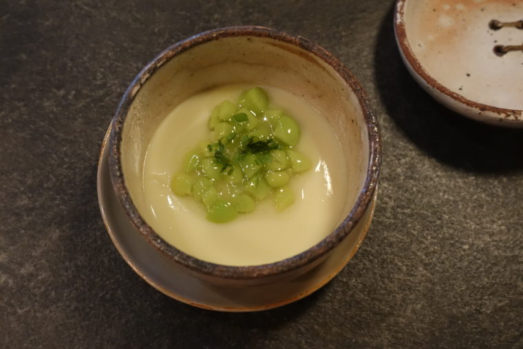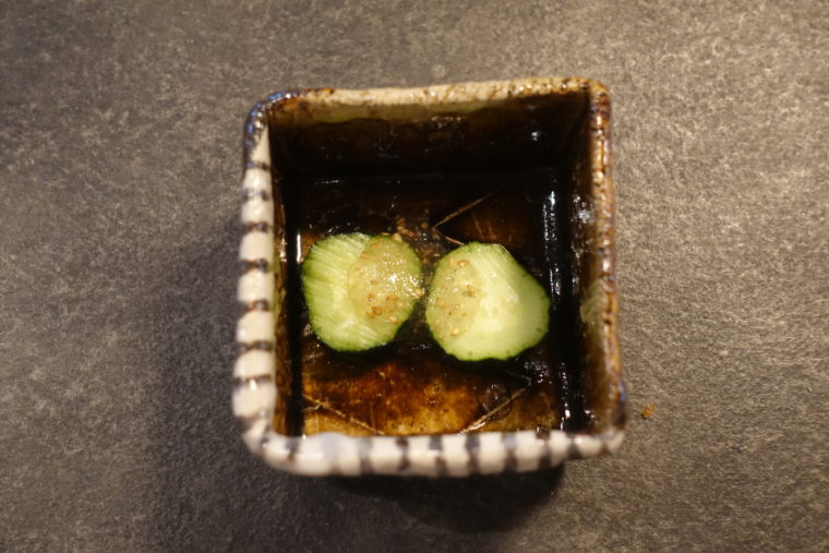 そしてもう一つ、強烈な印象を残したのが「きゅうり」の一皿。左右に置かれた二切れ。違いはただ一つ、切れ味。しかも、切断されたことにすら気づいていないような表情——まさに「A cucumber that doesn’t realize it’s being cut(切られていることに気づかないきゅうり)」という言葉がぴったりの存在。食感も香りももはやただのきゅうりではない。