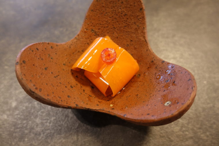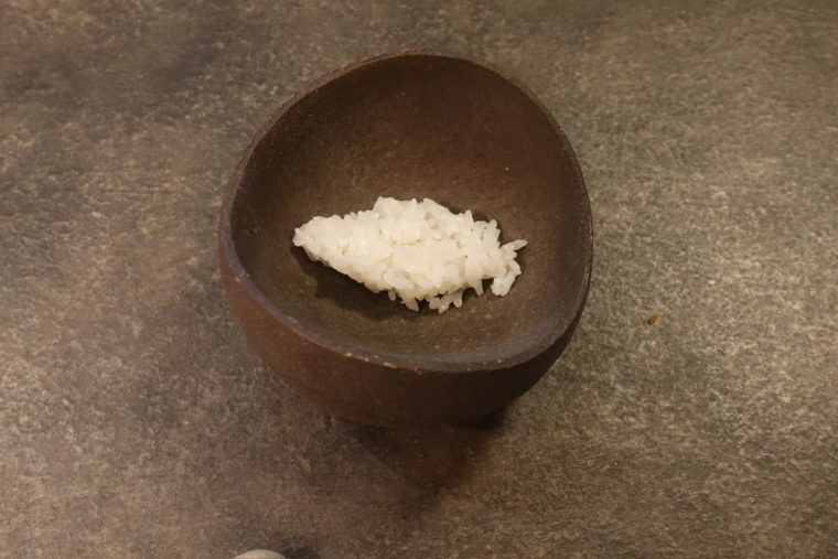 続く「DASHI 0.8」は、その鰹節を使った出汁。1番出汁の手前、“0.8番”と名付けられた一杯は、香りと旨味のバランスを極めた透明な液体。出汁とは、引き算で作られる芸術なのだと痛感する。旨味を削り、香りを引き出し、雑味は一切ない。まるで祈りのような出汁である。