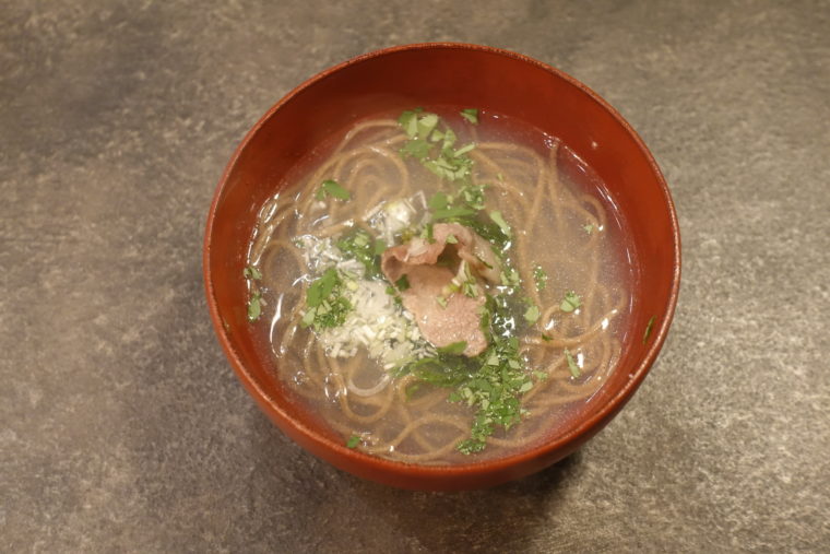 「麺×KIREAJI」では、はったい粉で打った麺を一本ずつ包丁でカット。そして、天橋立の浅利出汁、そして山菜で構成された一皿。
