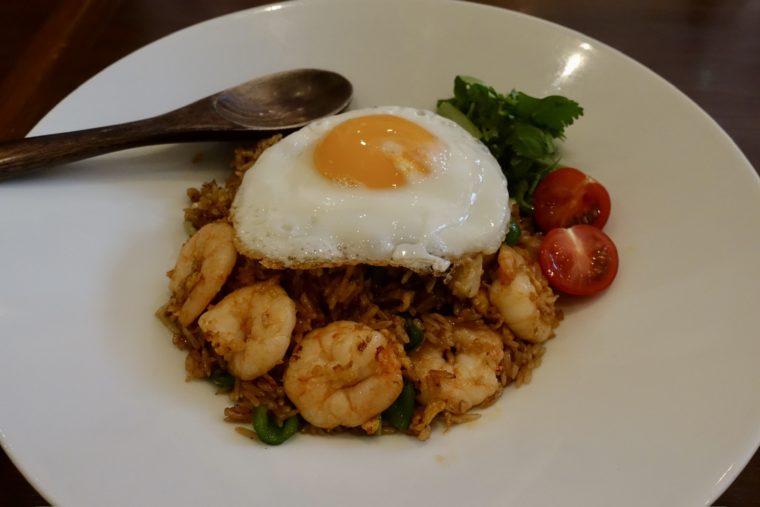 看板メニューの「海老たっぷりナシゴレン」は、インドネシアを代表する炒飯。細かく砕かれた米粒が濃厚な味付けをよくまとい、ピリ辛の風味が舌を刺激する。プリプリの海老に、ピーマンやキャベツの瑞々しさ。そこにパクチーの香りがアクセントとなり、南国の風を感じさせる一皿だ。