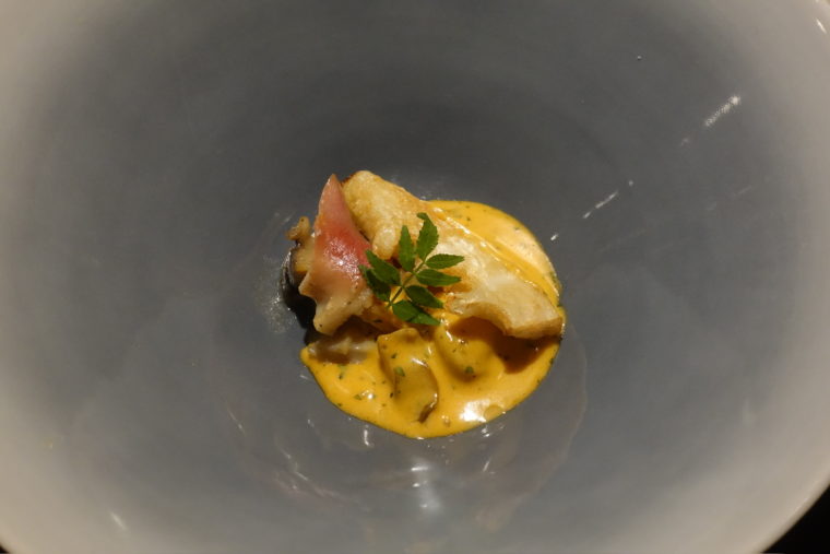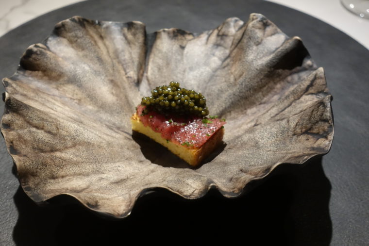 例えば、コース冒頭の「イノシン酸×脂」。旨味の凝縮したマグロとキャビアを、ブリオッシュと海藻バターで受け止める。大トロの濃厚な脂にじゃばらとブラックライムがキレを添え、寿司を想起させる構成にして、まさに主役級の存在感を放つ。