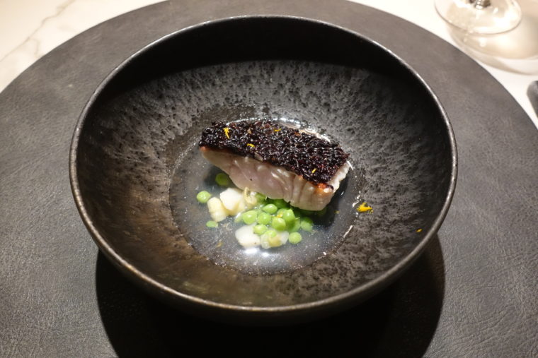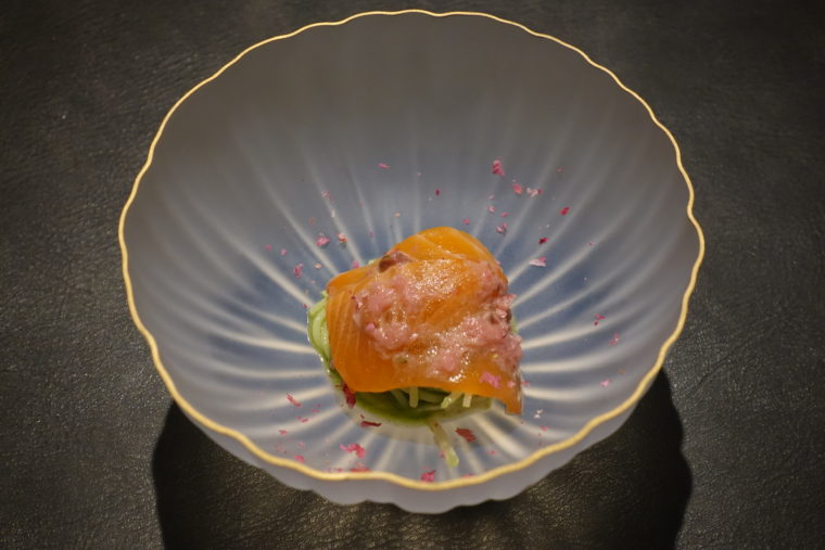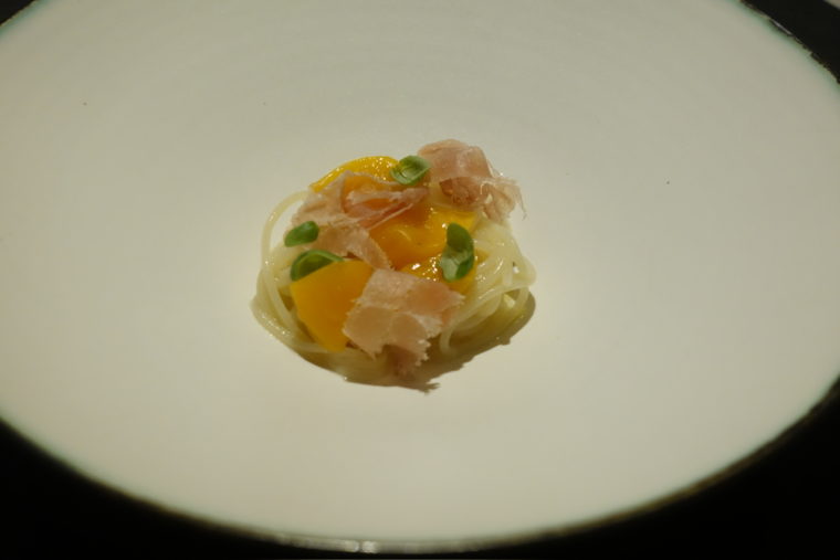 続く「さくら」は、カッペリーニにサクラマスをのせて、大葉とジュノベーゼで春らしい香りを演出。前菜で馴染みのあるカッペリーニではあるが、長谷川稔グループにかかると主役に見えるから不思議だ。笑