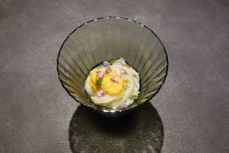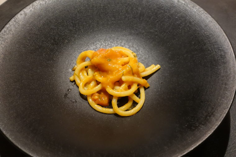 「のどごし」は、よもぎを練り込んだ米粉麺。もちもちとした食感に、トマトの酸味と雲丹のコクが重なり、ジャンルに収まらない自由な味わい。