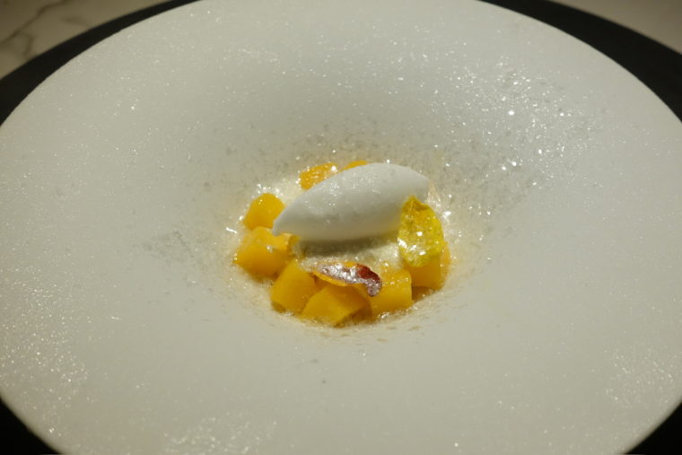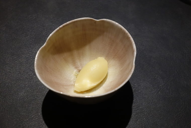 ここでやっとひと息。「がリンゴ?」は、りんごとガリのシャーベットを合わせた口直し。アップルビネガーの酸が効いていて、頭も舌も一気にリセットされる。