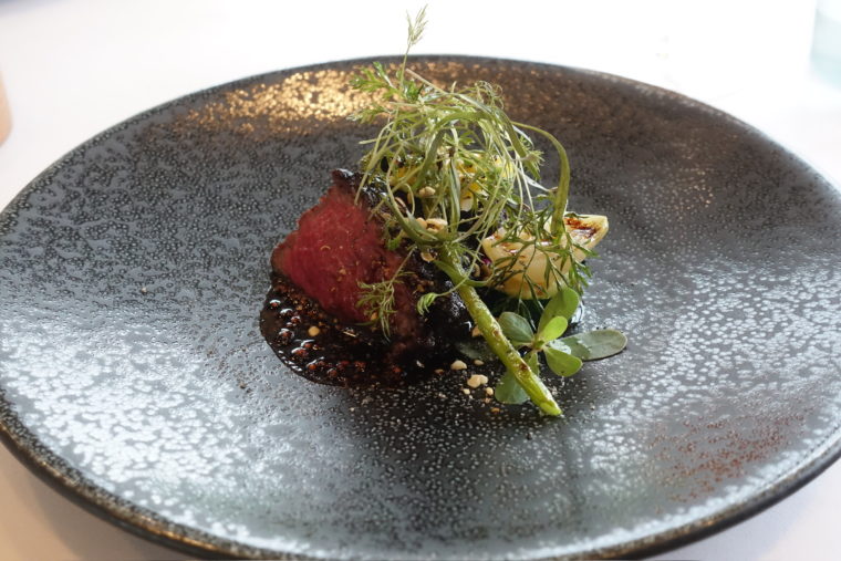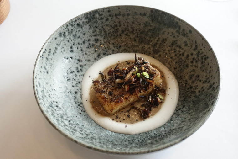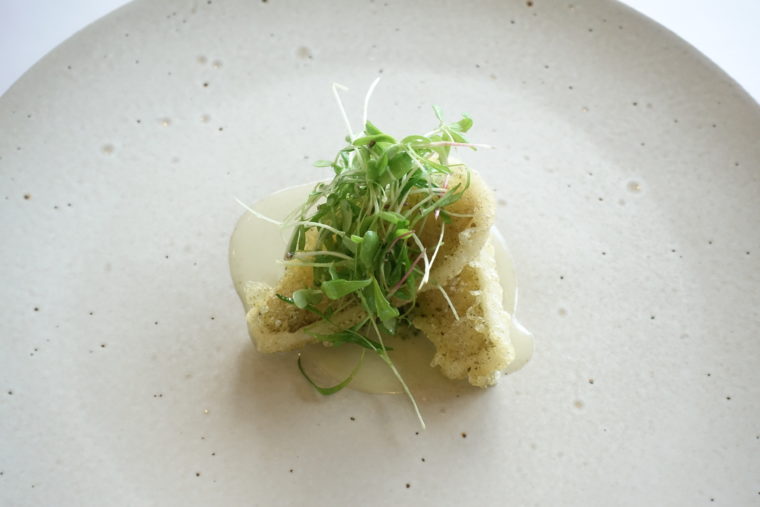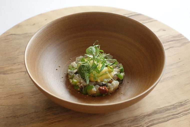 艶めくアオリイカの身に、カリフラワーのクリームを重ね、八朔の仄かな苦味と酸が奥行きを添える。仕上げには温かな蛤のソースを回しかけることで、冷たい構成の中にやわらかな温度差と、貝の旨味がふわりと立ち上がる仕掛け。上にはケールやハーブの新芽が繊細にあしらわれ、目にも鮮やかな装いに。