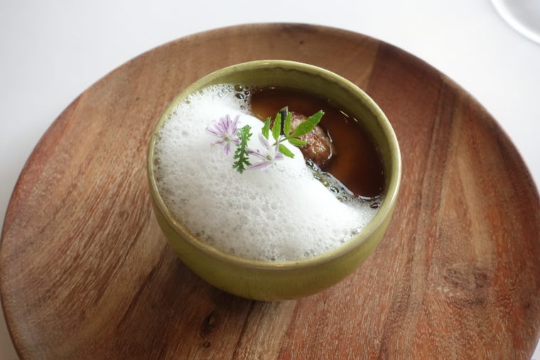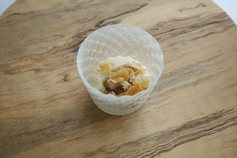 じゃがいもの冷製クリームに蛤を合わせた冷菜。なめらかなクリームの中に、蛤の身がそのまま寄り添い、しっとりとした食感とふくよかな旨味が広がる。レモンとバジルの香りが全体を爽やかにまとめ、上にはエルダーフラワーが軽やかに舞う。ポテトチップ風のトッピングが、滑らかな口当たりに楽しいコントラストを添える。