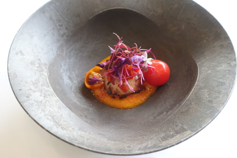 地元産の蛸を主役に据えた温菜。しっとりとやわらかく火入れされた蛸に、爽やかな酸味のフロマージュブランが寄り添う構成。トマトのソースが全体をやさしく包み込み、明るく豊かな味の広がりを演出する。口に含むたび、素材の素直な旨味がふわりと広がる一皿。
