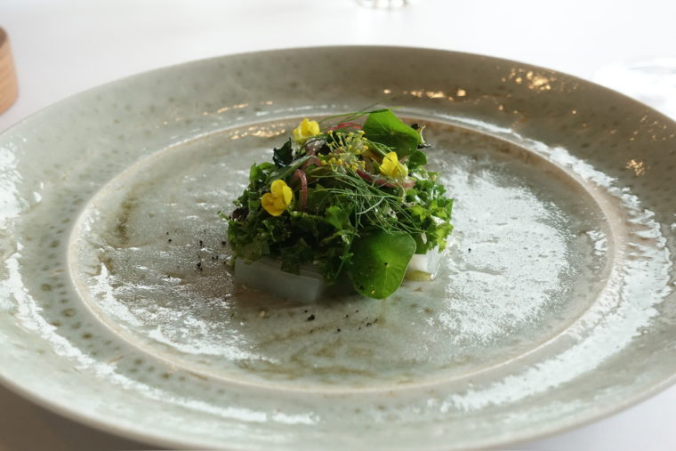 福岡・姪浜の鱚のフリット。ふわりと揚がった身は軽やかで香ばしく、そこに合わせるのはよもぎとベルモットの香りを纏わせたソース。ほのかな苦味とハーブの清涼感が、鱚の淡白な旨味を引き立てる。添えられた向日葵、蒲公英、などの若葉が、春の野原を思わせるような生命感を皿に与えていた。
