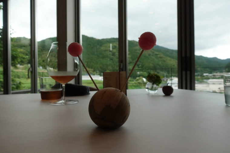 食後に登場するのは、郷愁をスッと突いてくる「西瓜のデセール」。丸く成形された「西瓜のシャーベット」が、窓の向こうに広がる田園風景と共鳴し、縁側で頬張った夏の記憶が蘇る。甘さも瑞々しさも控えめに、情景ごと溶けていくような一品だ。