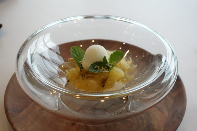 デセールは、この土地の空気感をそのまま閉じ込めたような一皿。呼子の甘夏と目の前に広がる油山の牧場でとれたミルク。そして「ソーヴィニヨン・ブランのジュレ」を合わせた一皿。