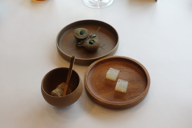 最後はプティフール三種。黒糖わらび餅、よもぎのフィナンシェ、文旦など、どれも小さな自然のかけらのようで、ひとつひとつが余韻を丁寧に繋いでくれる。