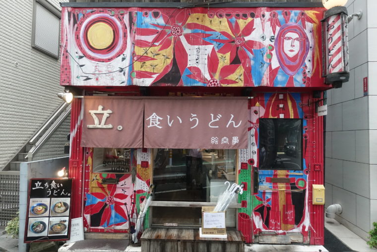 2025.06.25 昼 ポップな見た目に、真面目な玄米うどん。@絵空事 うどん 原宿・表参道・青山 1000円〜2999円 ★★★☆☆ 神宮前の路地裏、原宿のポップな空気感にすっと馴染む外観の『絵空事』。絵画のような色彩に覆われた外装は、まるでギャラリーのようだが、提供されるのは立ち食いスタイルのうどんというギャップの妙。非日常的なビジュアルとは裏腹に、実際の料理は非常に真面目で実直。立ち食いの枠を超えたアプローチが垣間見える。 店の軸となるのは「玄米うどん」。小麦を使わず、玄米粉で打った麺はグルテンフリー。もちもち系とは異なる歯切れの良さと、すっきりとした後味が印象的だ。米油で揚げた天ぷらなど、素材の選び方に一貫したコンセプトを感じる。食べていて身体にやさしい印象を受ける一方で、その個性がダイレクトに“おいしさ”として響くかは、好みが分かれるかもしれない。 看板の「肉うどん」は、たっぷりの甘辛く煮た牛肉が主役。その味付けは力強く、うどんの軽やかさとのコントラストは明快。「とり天」はカリッと香ばしく、中はふっくらとジューシー。満足感のある揚げ物だが、味の輪郭はやや濃く、食べ進めるうちに主張の強さが印象に残る。 全体として、素材や技法に工夫を重ねた立ち食いうどんの新しい形を提示しているが、その構成が持つ説得力や一体感には今後の伸びしろも感じられる。ただ、その試みが“身体にいい”という満足に加え、“また食べたい”という欲求につながるかどうか。そのあたりの微妙なバランスに、まだ過渡期的な面があるのかもしれない。 それでもこの立地、この価格、この世界観で、これだけの一杯を出している点は十分に評価に値する。気取らずふらりと寄れる“うどん版セレクトショップ”のような場所。軽やかで、真面目で、少し風変わり。そんなうどん屋があってもいい。ご馳走様でした。 — 絵空事東京都渋谷区神宮前3-27-3https://tabelog.com/tokyo/A1306/A130601/13286007/