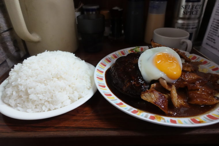 この日の注文は「ハンバーグと上ロース生姜焼き目玉焼き付き」。まずはハンバーグ。ぎゅっと詰まった肉の密度が心地よく、むちっとした食感が楽しめる。濃厚なデミグラスソースがかかり、ひと口ごとにご飯を呼び込む力を持っている。