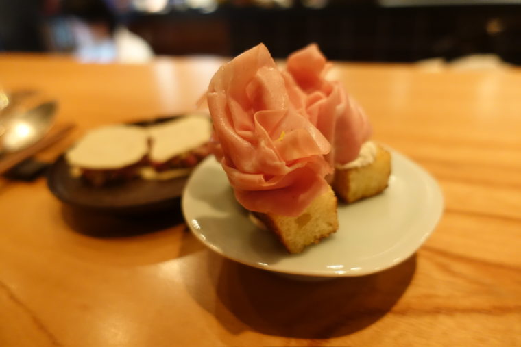 ブリオッシュの上に乗せた「モルタデッラ」。ふわりと甘い生地にサワークリームを添え、薔薇の花のように折り重ねたハムが咲いている。口にすれば、パンの甘みとクリームの酸味、モルタデッラの塩気が一体となり、ワインとマリアージュしていく。
