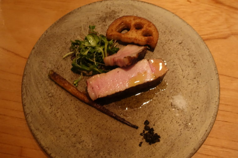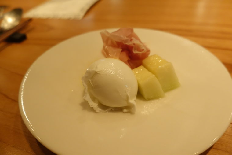 次に現れたのは「水牛モッツァレラと生ハム、静岡メロン」。使われるのは木更津・竹島さんが手がける貴重な国産の水牛モッツァレラ。草の香りをまとった乳の甘みがしっかりと感じられ、まさに“生きたチーズ”。そこに熟成の旨味を湛えた生ハムと、追熟した静岡メロンの瑞々しい甘さが重なる。塩味、甘味、コクがひとつにまとまり、土地と土地をつなぐような皿に仕上がっていた。