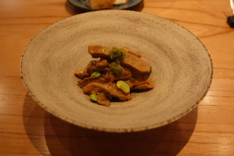 ひとつは「ギアラの煮込み ライム胡椒」。牛の第四胃を鶏の出汁でじっくりと煮込み、仕上げにライム胡椒を添えてある。濃厚な旨味の奥から爽やかな柑橘の香りが立ち上がり、こってりとした内臓料理に清涼感を与えていた。重さを感じさせないバランスが心地よい。