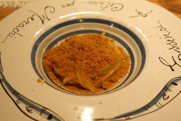 「馬肉のタルタル」は、魚醤で下味をつけ、サルデーニャ伝統の薄焼きパン「カラサウ」でサンドしたもの。生肉の力強さを発酵の旨味が支え、薄く軽やかなパンが全体をまとめる。素朴な郷土食材が、ここでは洗練された小前菜へと姿を変えていた。