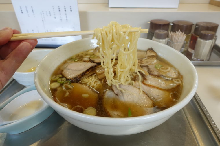 2025.08.26 昼 ただの老舗にあらず、ラーメン史に残る一杯@永福町 大勝軒 ラーメン・つけめん 京王・小田急沿線 1000円〜2999円 ★★★★☆ 永福町の駅前の行列は日常の風景。その先にあるのは1955年創業の「大勝軒」。ラーメン好きが“大勝軒”と聞けばまず思い浮かべるのは、つけめんで有名な東池袋大勝軒だろう。だが、ここ永福町は全くの別流派。山岸一雄が広めた“つけめん文化”に対して、草村賢治が築いたのは“中華そば文化”。同じ「大勝軒」の名を掲げながらも、両者はまったく異なる道を歩んでいる。 永福町大勝軒の象徴は、まずその丼のサイズだ。標準の中華麺ですら他店の大盛りを軽々と超える麺量。 やわやわに茹で上げられた中細縮れ麺は、澄んだ煮干しスープをしっかりまといながら胃袋に収まっていく。 スープは大量の煮干しを大鍋で豪快に煮出し、動物系の旨味で骨太に支える清湯仕立て。レンゲを運ぶと、煮干し特有の香りと苦味、甘みが幾重にも重なり、飲み進めるほどにクセになる。東池袋の濃厚な動物魚介系とは真逆の方向性、だがどちらも中毒性を持っている点は共通している。 具材はシンプル。薄切りの「チャーシュー」は丼を覆い尽くし、スープに浸ることでしっとりと旨味を増す。「メンマ」が歯ごたえを生み、ネギが香りの輪郭をつける。そして名物「生卵」。すき焼きよろしく麺を潜らせると、まろやかさが加わり、煮干しスープに新たな表情が生まれる。 永福町大勝軒とは、ただの老舗ではなく、ラーメン界に確固たるジャンルを築いた存在。東京ラーメン文化の古典をいまに残すと同時に、その系譜は全国に広がり続けている。その一杯に向き合うことは、行列に並ぶという時間すら含めて、ラーメン史を体験する行為そのものだ。ご馳走様でした。 — 永福町 大勝軒03-3321-5048東京都杉並区和泉3-5-3https://tabelog.com/tokyo/A1318/A131805/13011769/