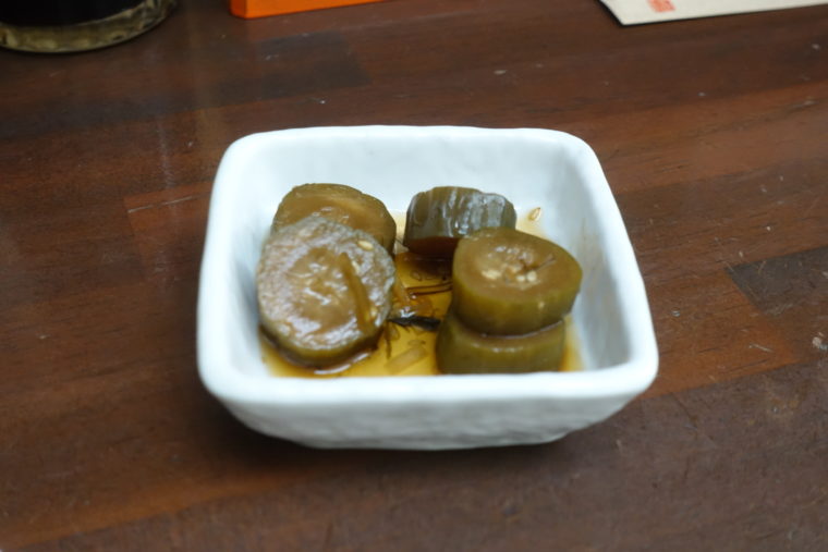 漬物はきゅうりの醤油漬けで、甘辛さが箸休めにちょうどよく、全体のリズムを作り出す。