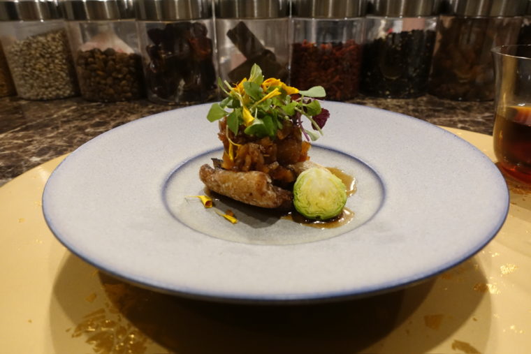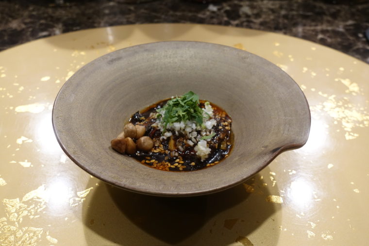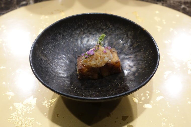 魚介料理では「鰻」が登場。ふっくらと焼き上げた鰻にまとわせるのは、丸みのある酸味を持つ甘酢ソース。さらに上には赤玉ねぎのシャキッとした辛味、新生姜の爽快さ、発酵唐辛子の奥深い辛味が重ねられる。鰻の脂をすっきりと導きながら、噛むごとに異なるニュアンスが顔を出す構成だ。そして添えられる子持ち昆布の揚げ物。プチプチとした食感と力強い旨味がユニークな存在感を放つ。