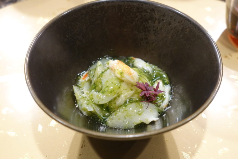 コースの幕開けは「真紅のルビークラゲ」。赤酢と柘榴で鮮やかに染め上げられたクラゲは、ガラス細工のように艶やか。口に含めば、最初にくるのは赤酢のシャープな酸味。そのあとに柘榴の甘みがふわりと広がり、最後はクラゲ特有のぷるりとした食感が心地よいリズムを刻む。