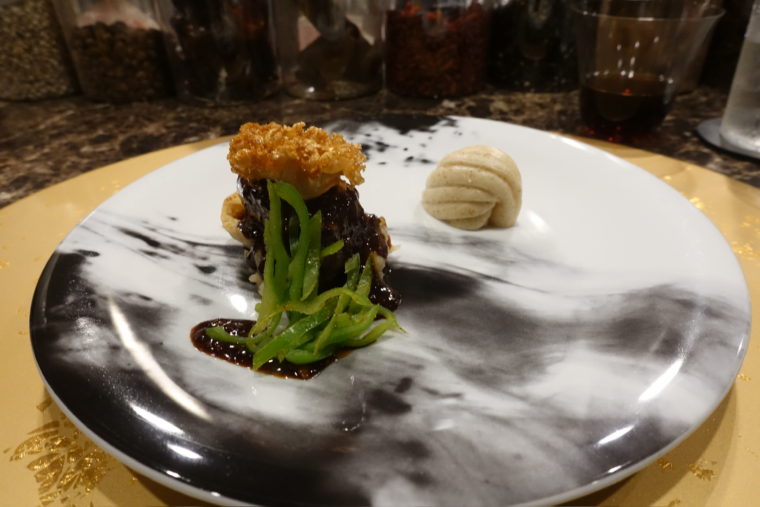 次に登場する「大根餅」。外側はこんがりと香ばしく焼き上げられ、箸を入れるともちっとした弾力が返ってくる。そこに添えられるのは、生の帆立から仕立てた特製XO醤。ひと口ごとに帆立の甘みと深いコクが広がり、素朴な餅の中に贅沢な旨味が重なる、この店らしい遊び心あふれる一皿だ。