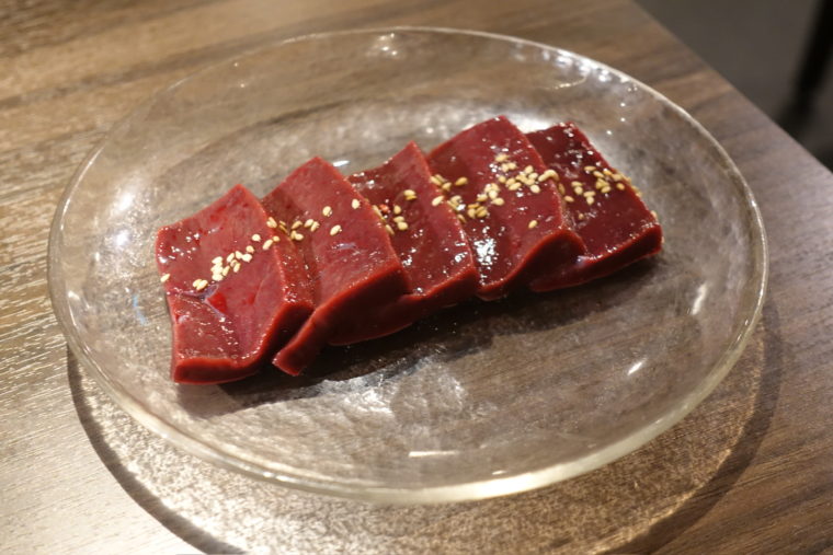 「新鮮レバー」はこの店の象徴。ごま油と塩でシンプルに味わえば、濁りのないクリアな旨味とねっとりとした舌触りが際立つ。臭みがまったくないのは仕入れの確かさの証拠だ。