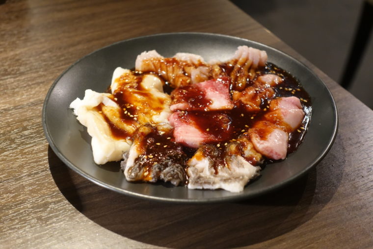 そして目玉の「ホルモンミックス5種盛り」。ヤン、上ミノ、シマチョウなど、部位ごとに食感も旨味もまるで違う。特に「ヤン」は脂の甘さと弾力の同居が見事で、噛み進めるたびに旨味があふれ出す。鉄板の上で焼ける音と香りだけでも酒が進んでしまう。