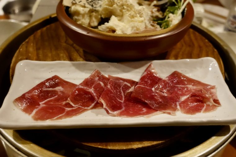前菜には「ラムの生ハム」。塩気は控えめで、熟成香が鼻に抜ける。ラム特有の個性をマイルドに楽しませてくれる仕掛けで、ここからビールが止まらなくなる。