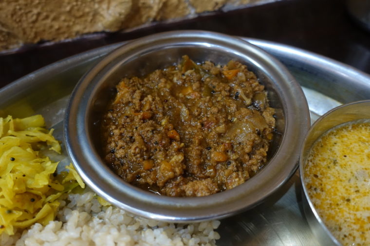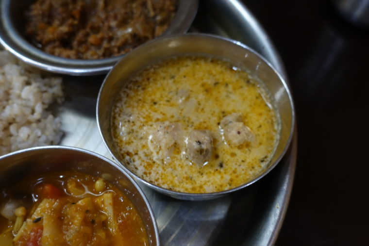 「メティマライチキン」は一転してクリーミー。カシューナッツ由来のコクがベースにあり、ほろりと柔らかな鶏肉がそれに溶け込む。辛さを抑えたバランスで、他のカレーと合わせても喧嘩をせず、プレート全体を包み込むような役割を果たしていた。