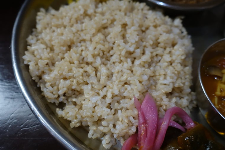玄米ご飯のぷちぷちとした歯ごたえ、副菜のキャベツやアチャールの酸味が口の中をリセットし、自然とカレー同士を混ぜてしまう。バラバラの個性が皿の上で一つにまとまっていく感覚は、ここならではの楽しみだろう。